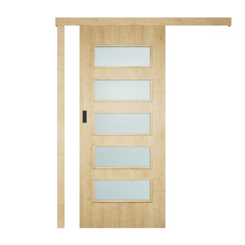 Fal előtt futó tolóajtó rendelhető elemei: ajtólap húzófogantyúval, sín, karnis,állítható tok, lassító szerkezet, horogzár.
